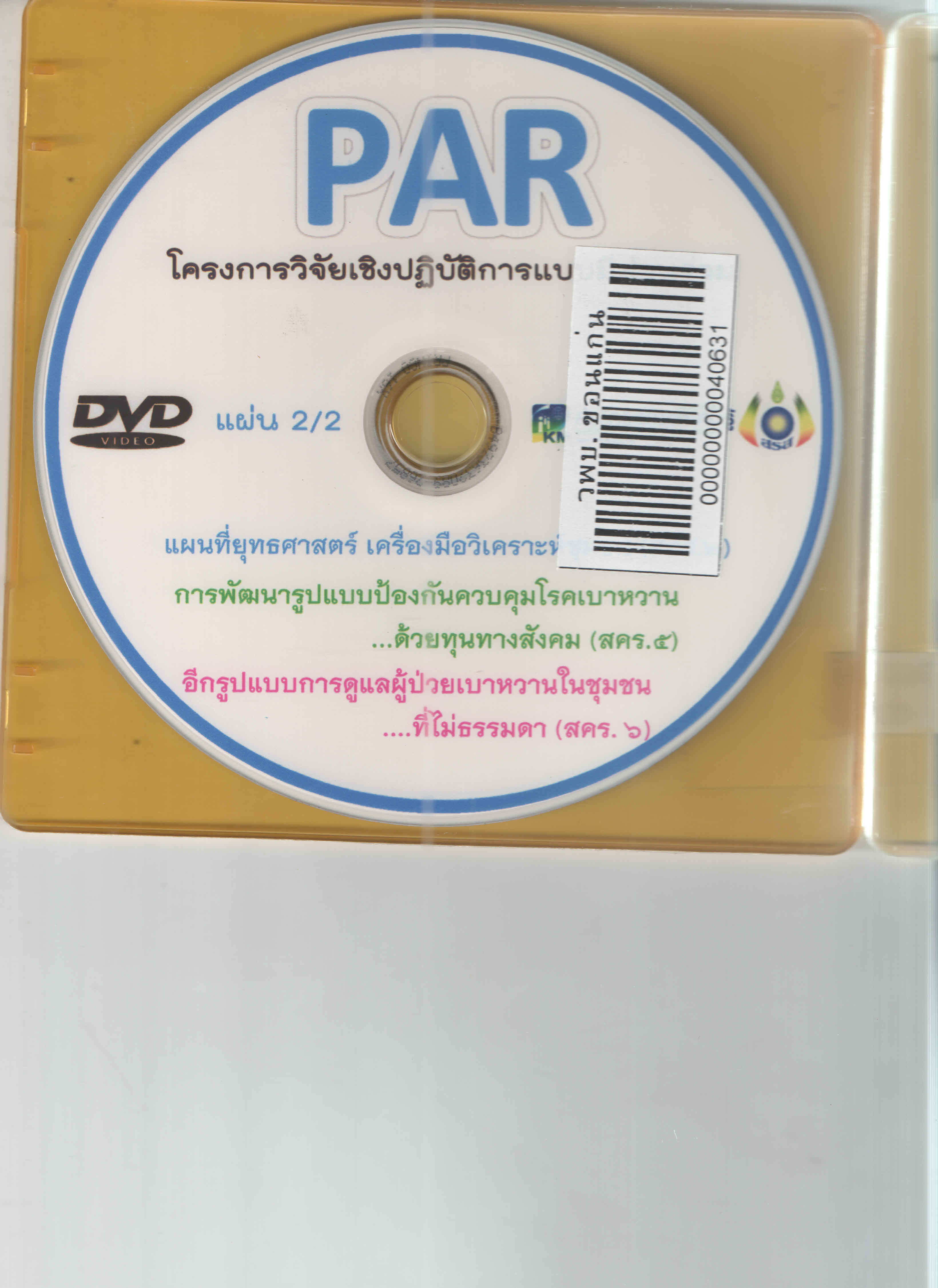 วีซีดี เรื่อง โครงการวิจัยเชิงปฏิบัติการแบบมีส่วนร่วม : แผนที่ยุทธศาสตร์เครื่องมือวิเคราะห์ชุมชน (สคร.2) การพัฒนารูปแบบป้องกันควบคุมโรคเบาหวานด้วยต้นทุนทางสังคม (สคร.5) อีกรูปแบบการดูแลผู้ป่วยเบาหวานในชุมชนที่ไม่ธรรมดา (สคร.6)./ สำนักจัดการความรู้. |