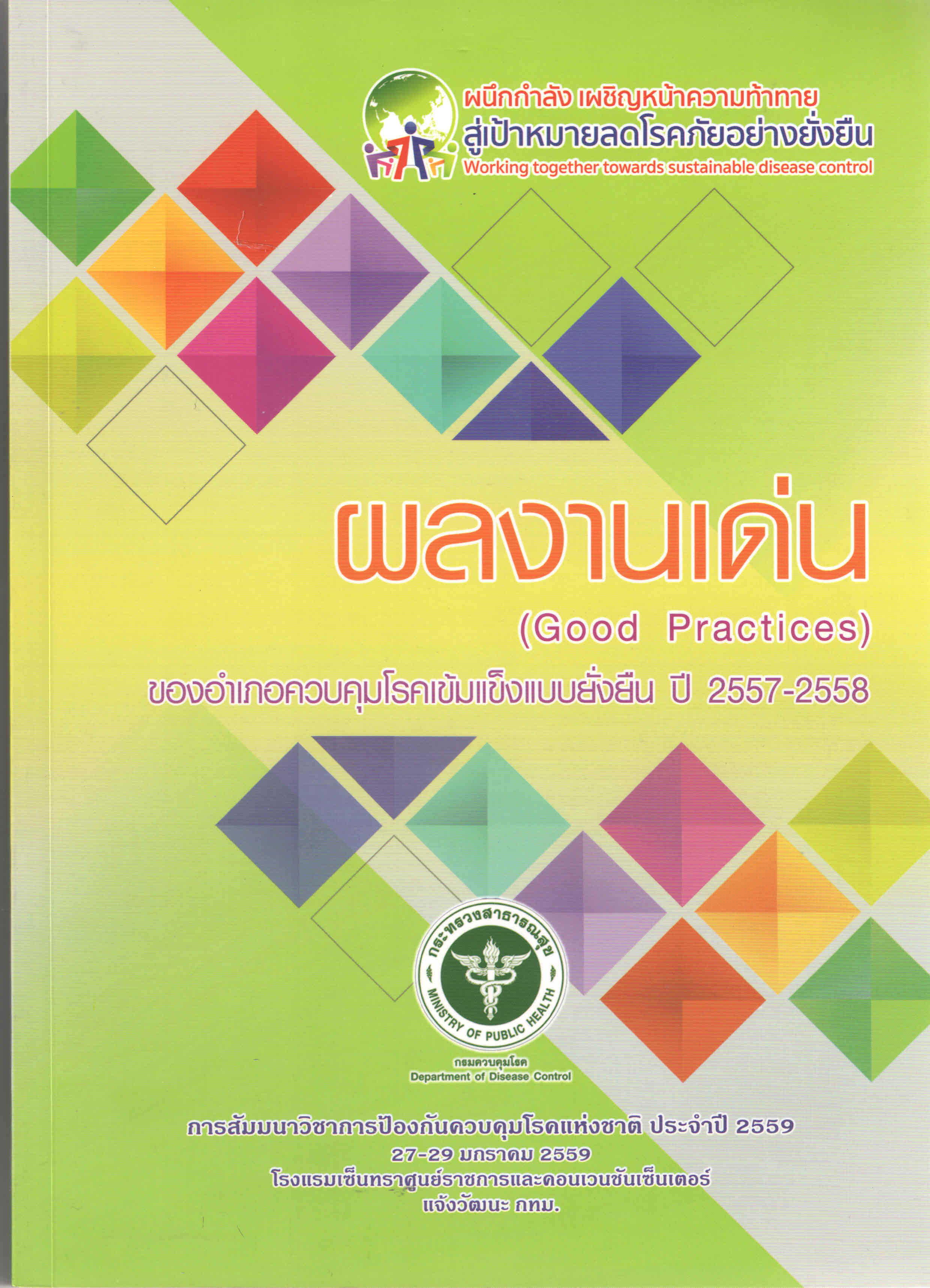 ผลงานเด่น (Good practices) ของอำเภอควบคุมโรคเข้มแข็งแบบยั่งยืน ปี2557-2558 : การสัมมนาวิชาการป้องกันควบคุมโรคแห่งชาติ ประจำปี2559 ระหว่างวันที่ 27-29 มกราคม 2559 โรงแรมเซ็นทราศูนย์ราชการและคอนเวนชันเซ็นเตอร์ แจ้งวัฒนะ กรุงเทพมหานคร/ สำนักจัดการความรู้ กรมควบคุมโรค. |