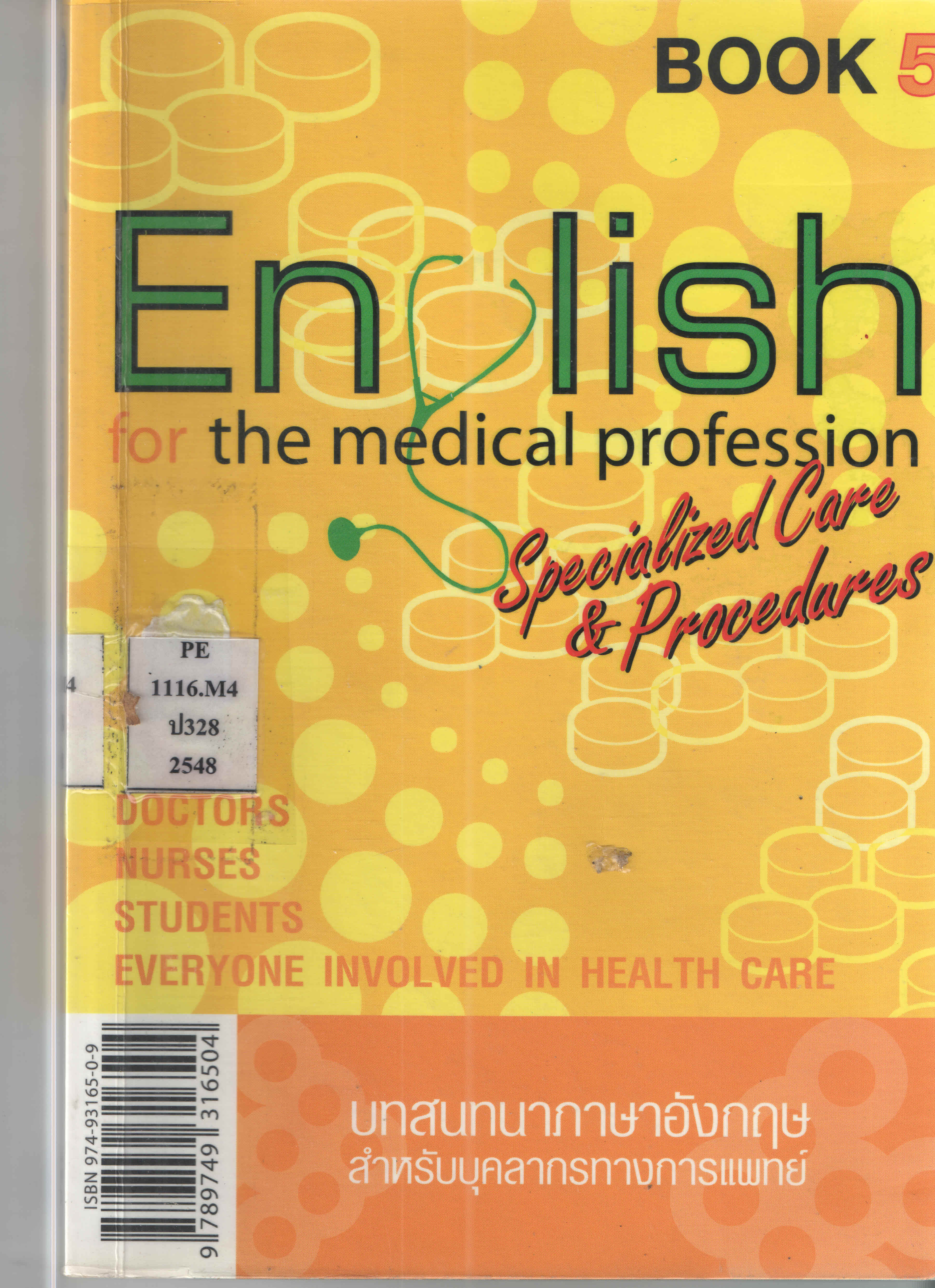 บทสนทนาภาษาอังกฤษสำหรับบุคคลากรทางการแพทย์,book five= English for the medical profession specialized care & procedures : doctor,nurses,students,everyone involved in health care.
