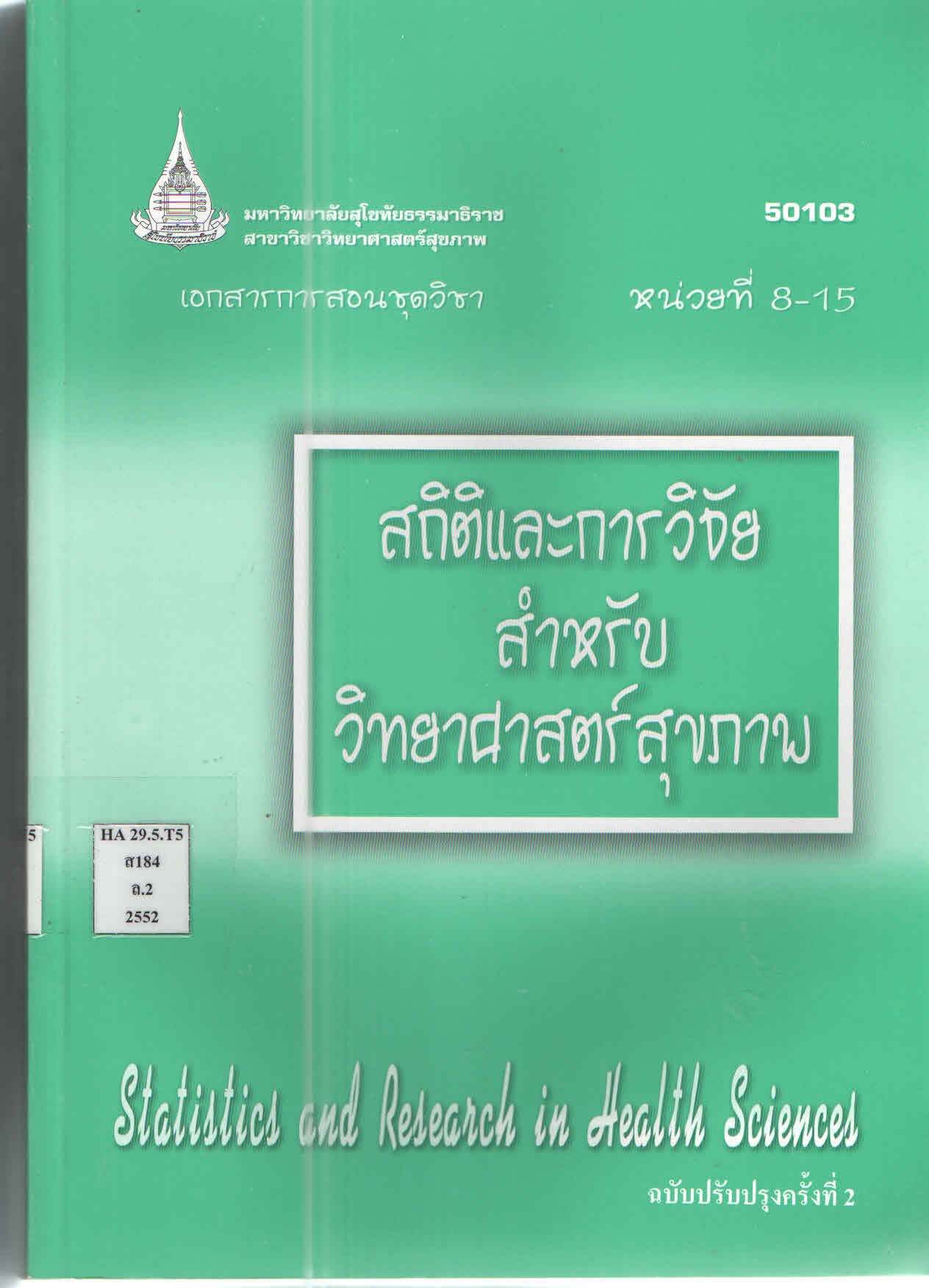 เอกสารการสอนชุดวิชา สถิติและการวิจัยสำหรับวิทยาศาสตร์สุขภาพ = Statistics and research in health sciences หน่วยที่ 8-15 สาขาวิทยาศาสตร์สุขภาพ มหาวิทยาลัยสุโขทัยธรรมาธิราช.