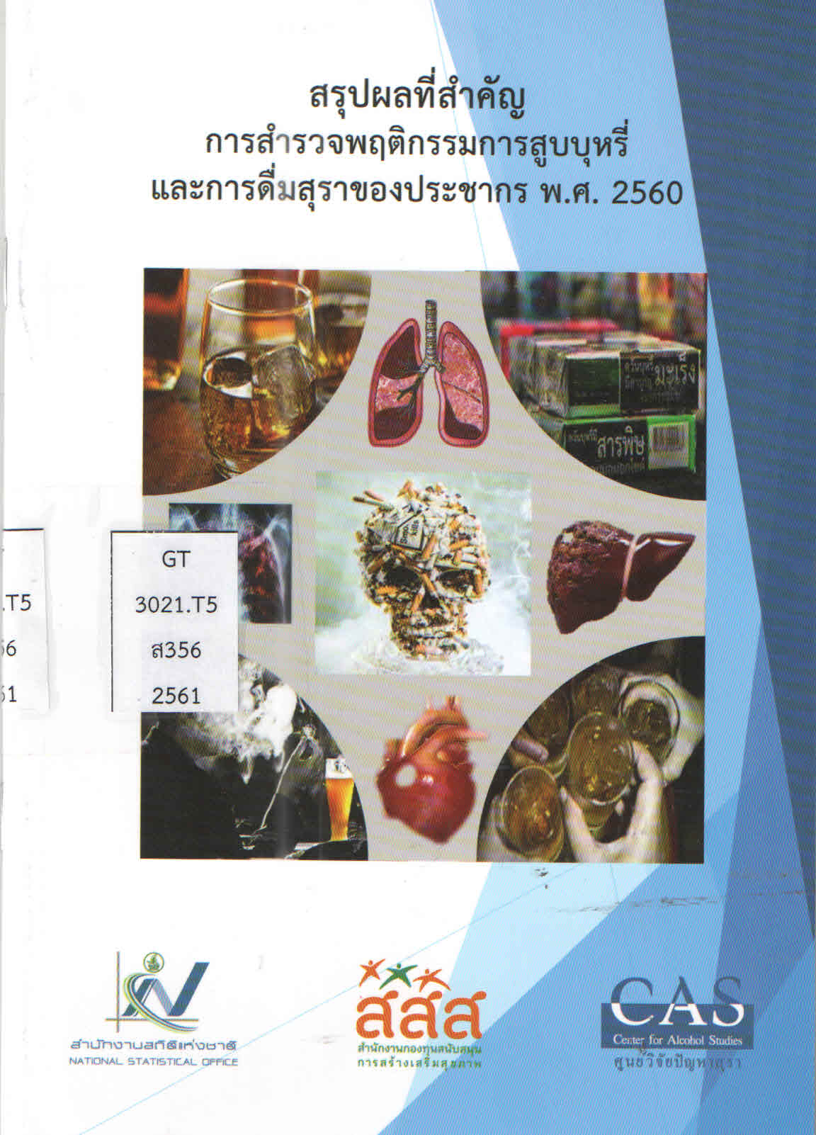 สรุปผลที่สำคัญการสำรวจพฤติกรรมการสูบบุหรี่และการดื่มสุราของประชากร พ.ศ.2560/ กองสถิติพยากรณ์ สำนักงานสถิติแห่งชาติ